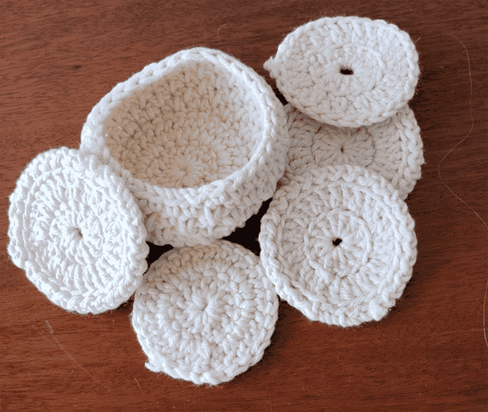 🧺 Conteúdo do kit: 5 ecopads + 1 potinho de crochê